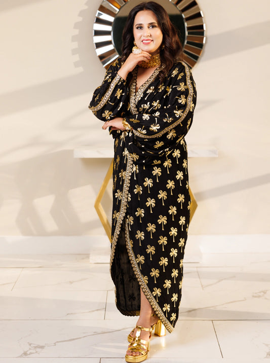 Celebrate timeless tradition with the Golden Eclipse Heritage Gown, a striking black and gold ensemble...