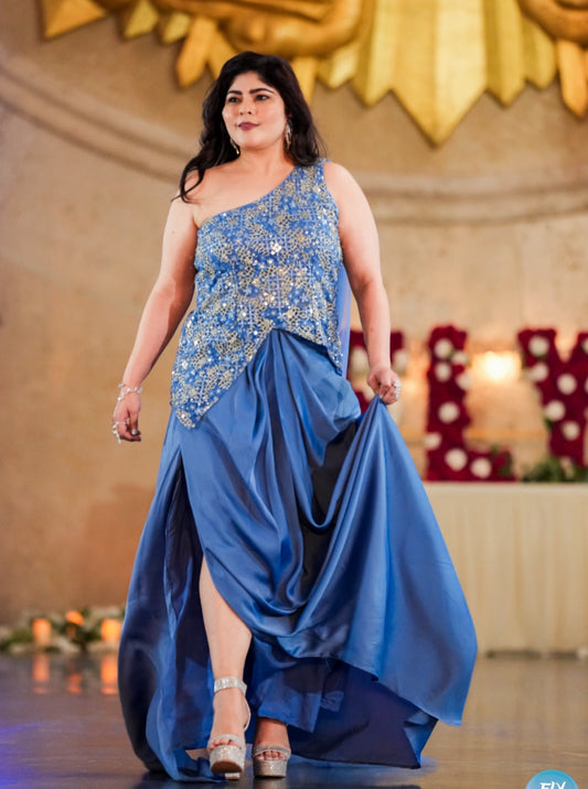 Shine like the night sky in the Celestial Sapphire Slit Gown, a one-shoulder masterpiece adorned...