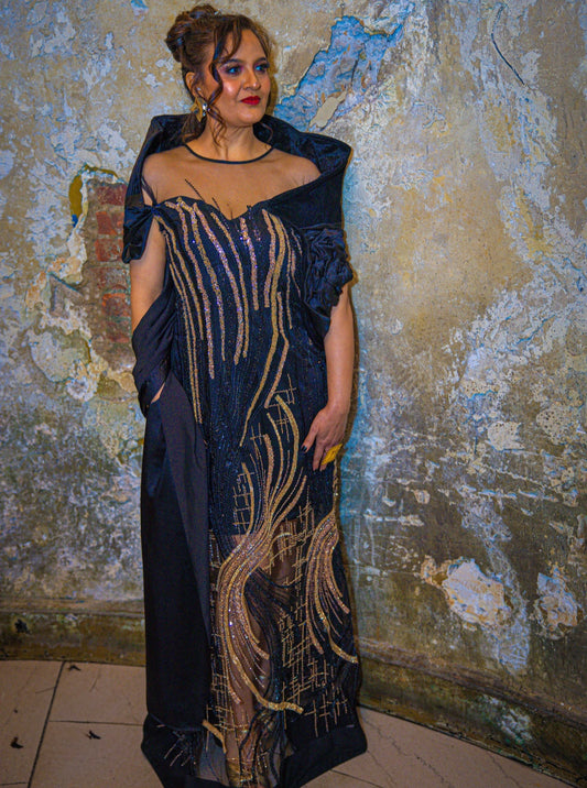 Celebrate timeless tradition with the Golden Eclipse Heritage Gown, a striking black and gold ensemble...