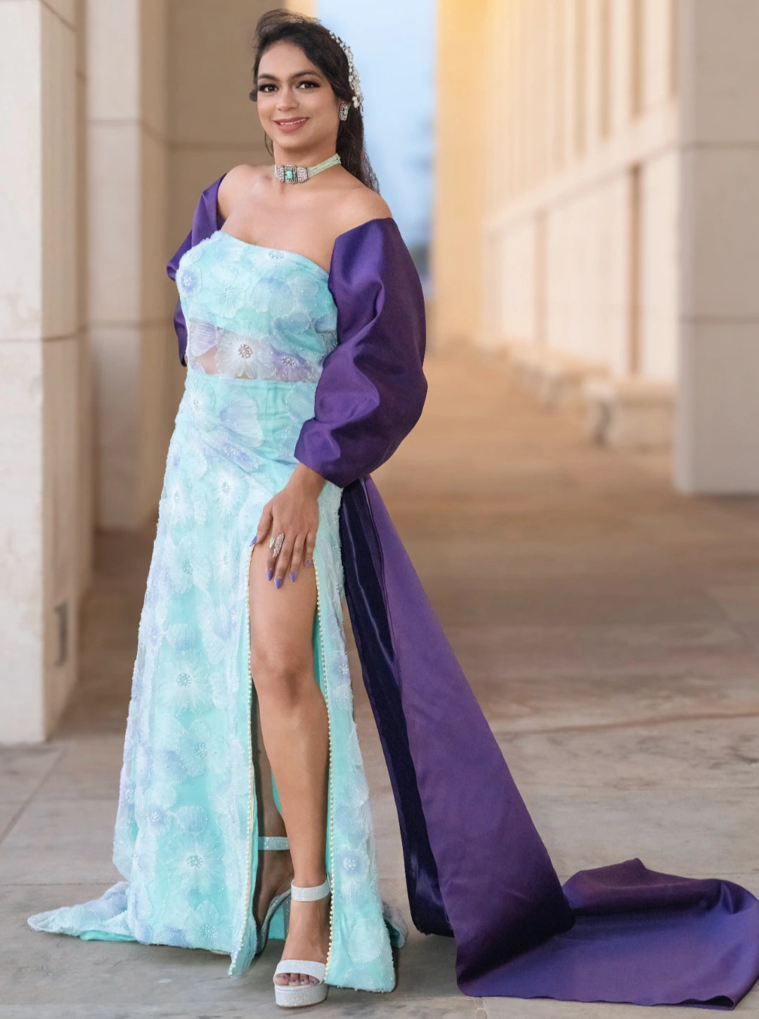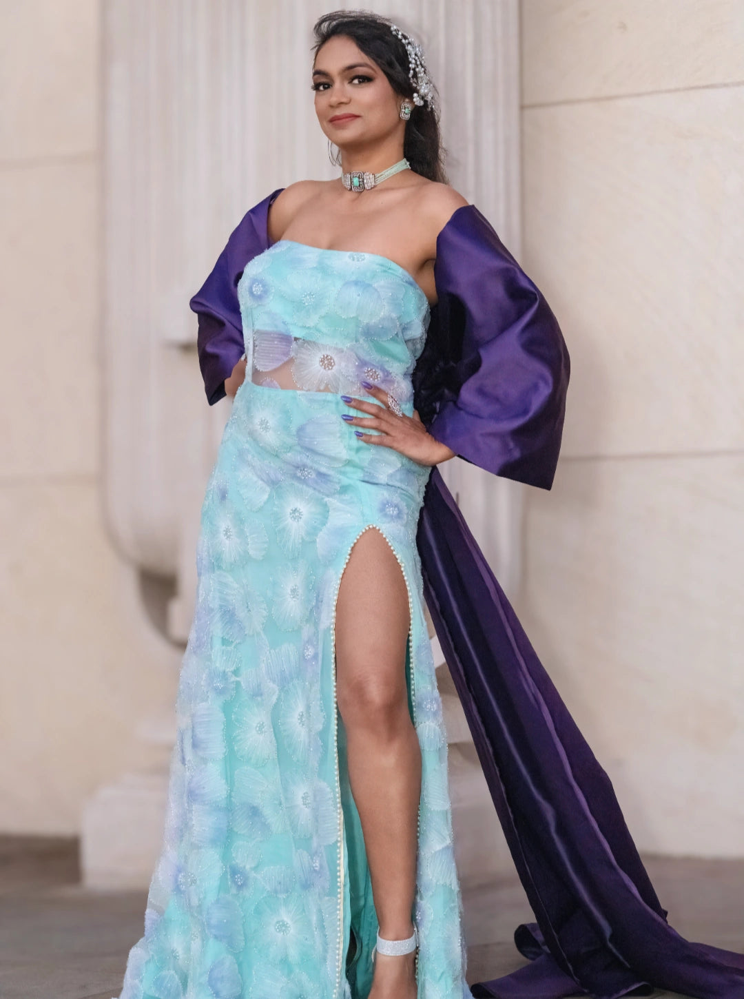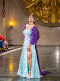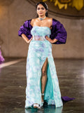 Turn heads in the Celestial Bloom Cape Gown, a dreamy fusion of elegance and edge. This off-the-shoulder light blue gown features delicate floral patterns and a daring high slit, perfectly balanced by a flowing purple cape that adds drama and movement. Designed for fashion-forward soirées, upscale events, or editorial shoots, this gown is a celebration of bold femininity and celestial charm.