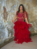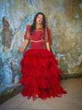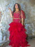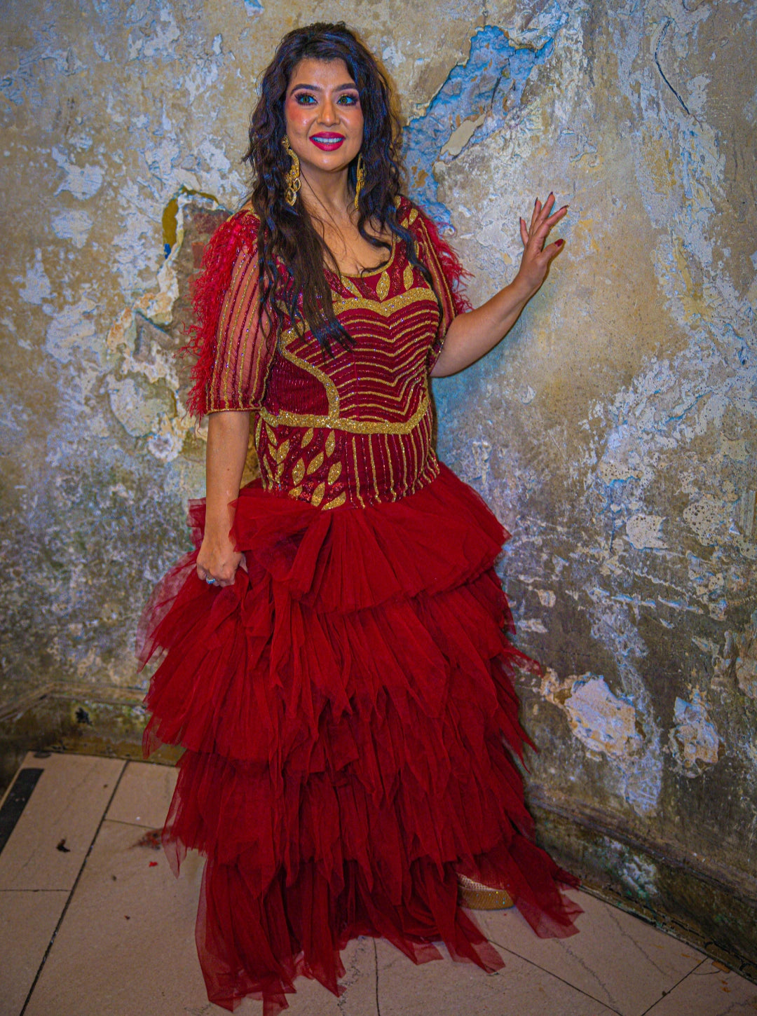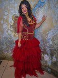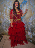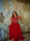 Make a majestic statement with the Crimson Royale Ruffle Gown, a show-stopping red ensemble layered with voluminous ruffles and adorned with intricate gold detailing on the bodice. Set against a textured backdrop, this gown evokes vintage opulence and modern drama—perfect for couture showcases, festive galas, or any occasion where grandeur is the dress code.