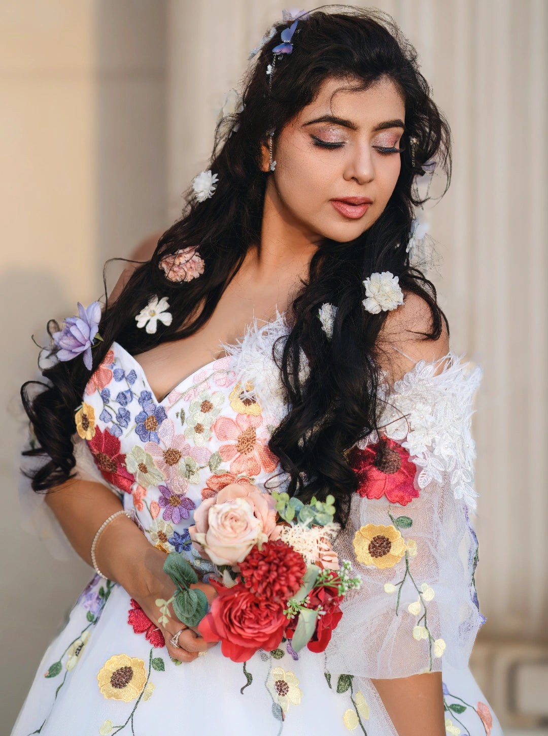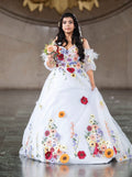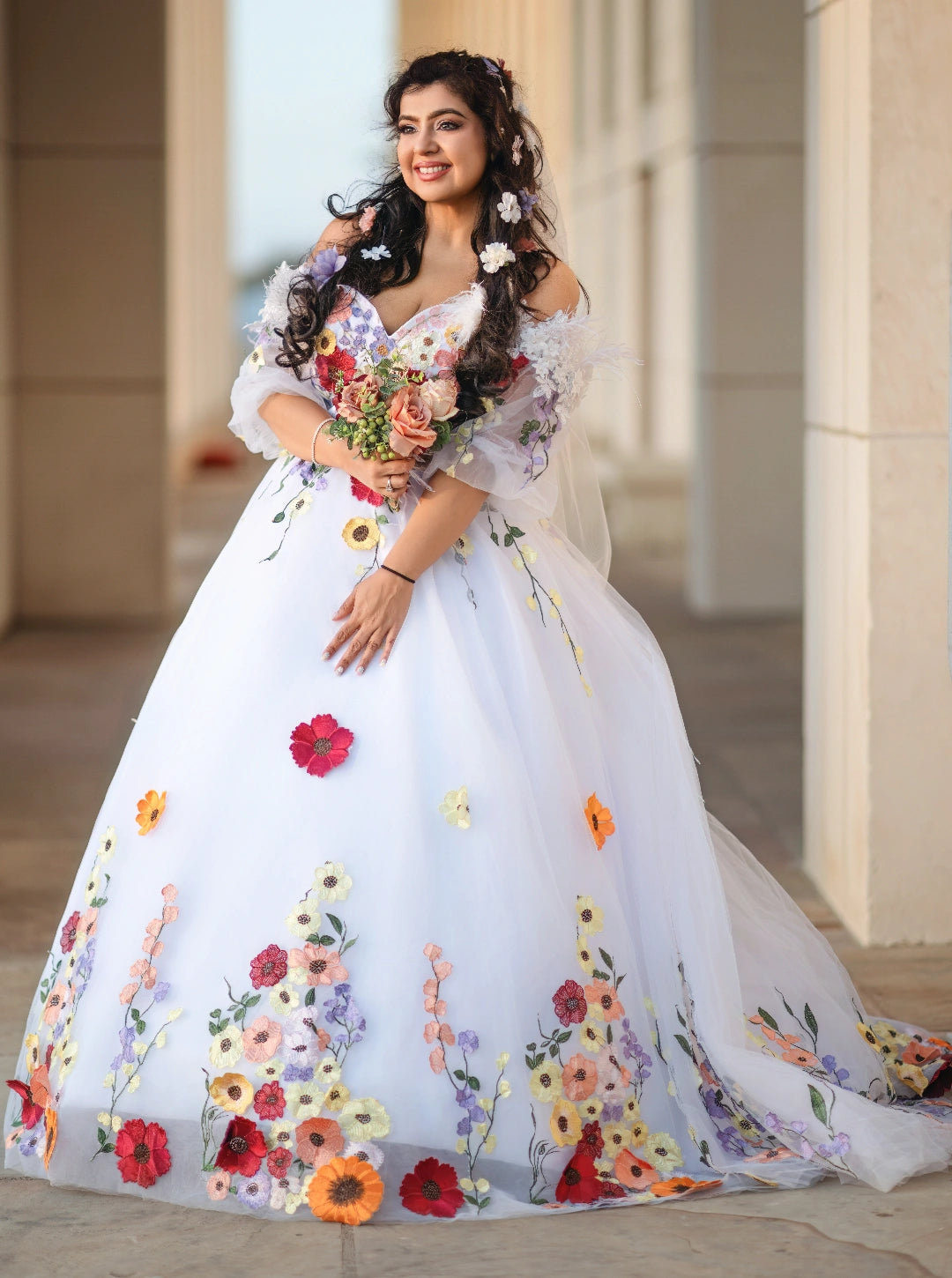Celebrate love in full bloom with the Floral Reverie Bridal Gown. This enchanting white wedding dress is delicately embroidered with vibrant floral motifs, bringing a whimsical touch to classic bridal elegance. Paired with a soft bouquet and set against timeless architecture, this gown is perfect for brides who want to blend tradition with a splash of color and personality. A romantic choice for garden weddings, destination ceremonies, or artistic bridal portraits.