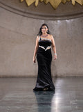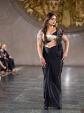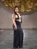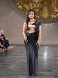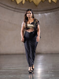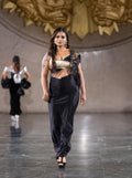 Make a grand entrance with the Golden Noir Runway Ensemble, a striking Indo-Western outfit featuring a black and gold top paired with a flowing black skirt. The rich tones and ornate detailing make it a perfect choice for fashion shows, festive galas, or upscale cultural events where elegance meets drama.