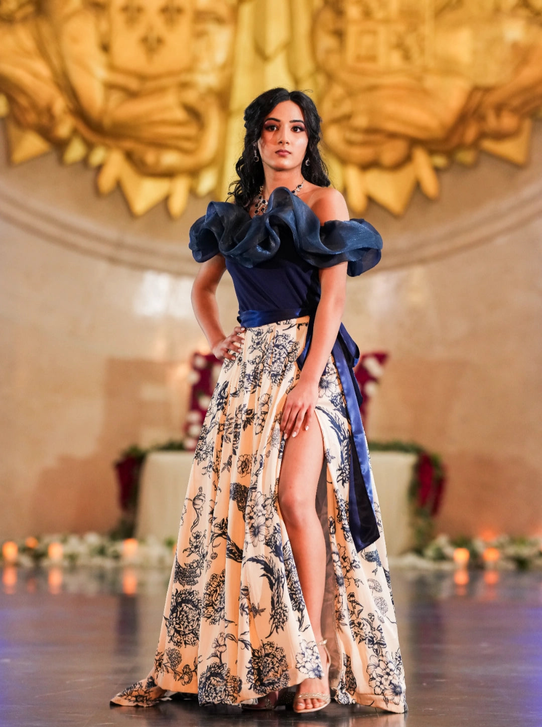 Elegance blooms in the Midnight Garden Off-Shoulder Gown, a navy blue ensemble featuring a structured off-shoulder top and a flowing floral skirt. Set against a ceremonial backdrop, this Indo-Western piece is perfect for festive evenings, cultural celebrations, or fusion fashion showcases that blend tradition with modern charm.