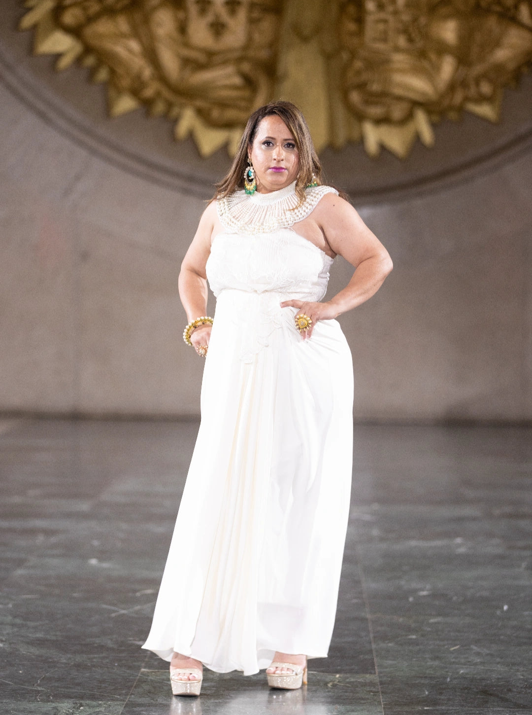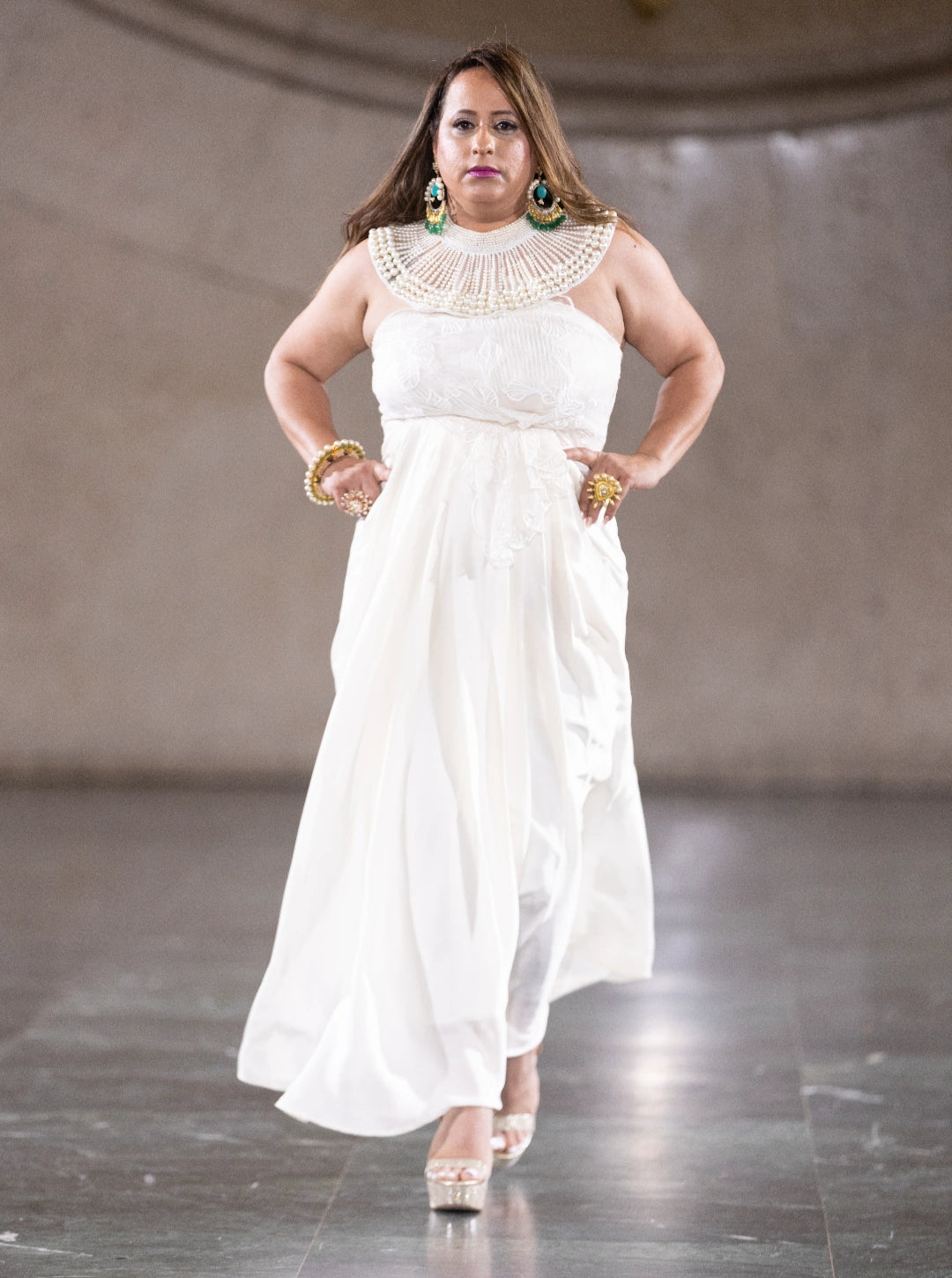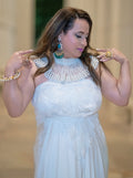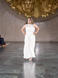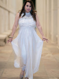 Glide with grace in the Moonlight Veil White Gown, a flowing silhouette that captures the purity and elegance of classic fashion. Paired with silver heels and set against a corridor of columns, this gown evokes a sense of serene sophistication—ideal for bridal events, formal evenings, or minimalist fashion showcases.