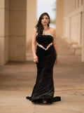 Refined and radiant, the Noir Elegance Embellished Gown is a stunning Indo-Western creation that pairs classic black with shimmering silver accents. The long silhouette and graceful detailing make it ideal for evening receptions, fusion fashion events, or upscale cultural gatherings.