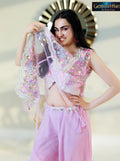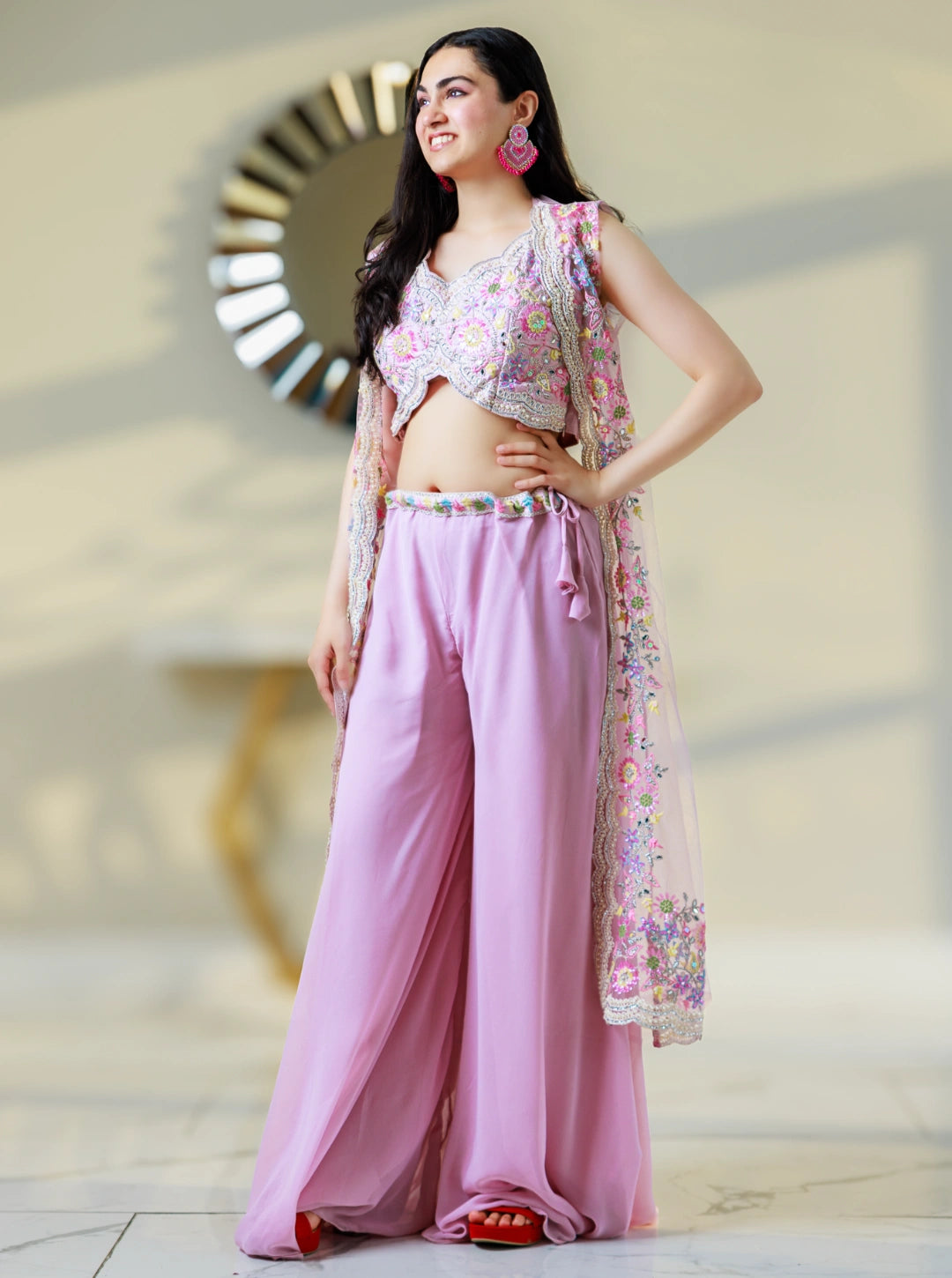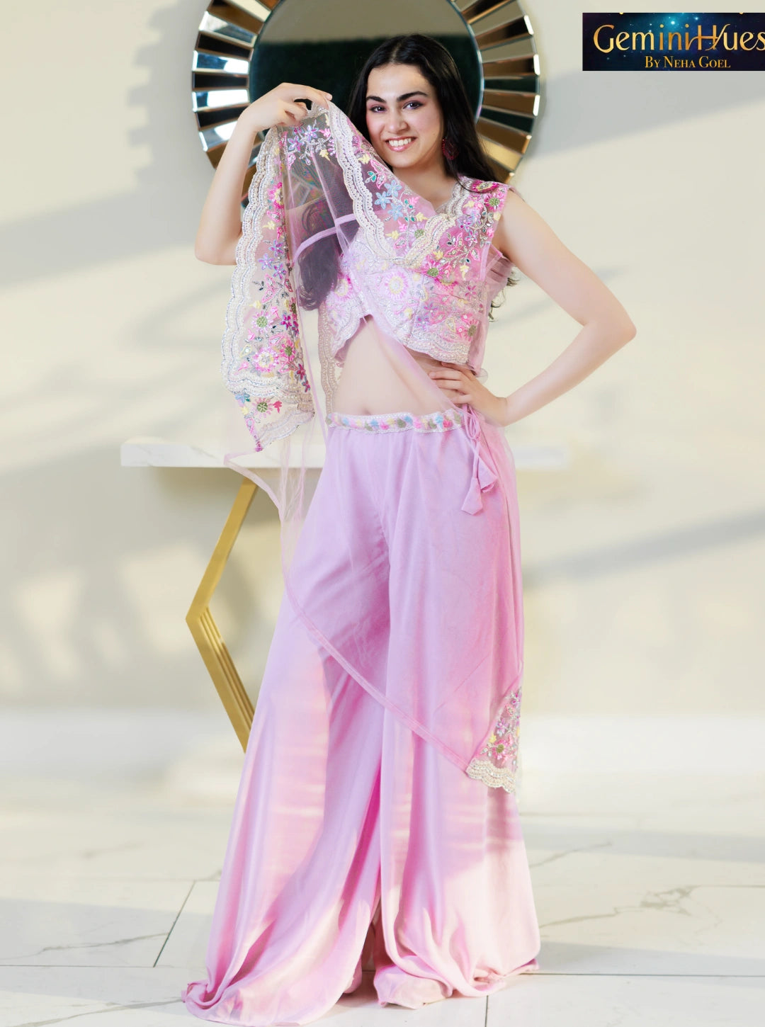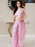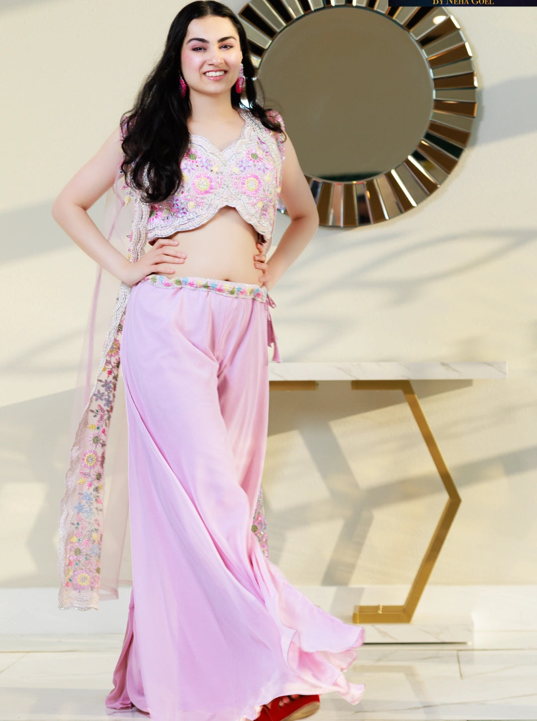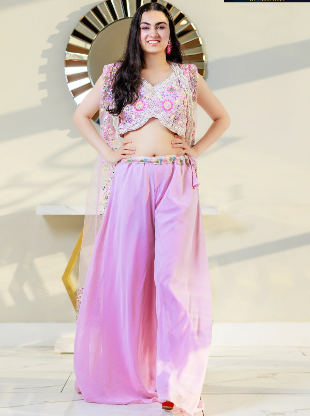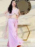 Blending tradition with contemporary flair, the Rose Quartz Fusion Set features a sleeveless embroidered jacket layered over a matching top and wide-legged pants in soft pink hues. Perfect for festive gatherings, cultural events, or modern bridal functions, this outfit radiates charm and sophistication with every detail.