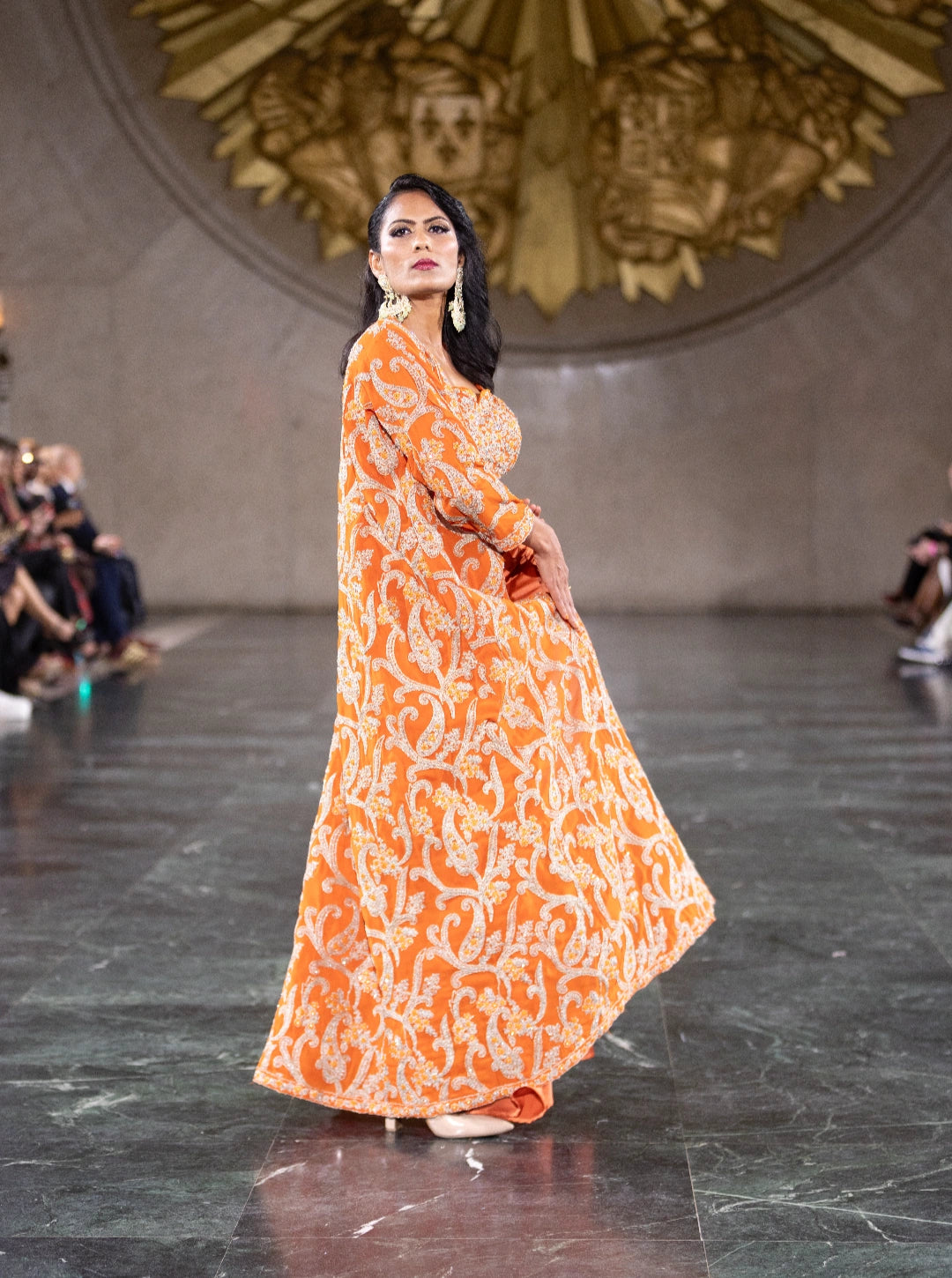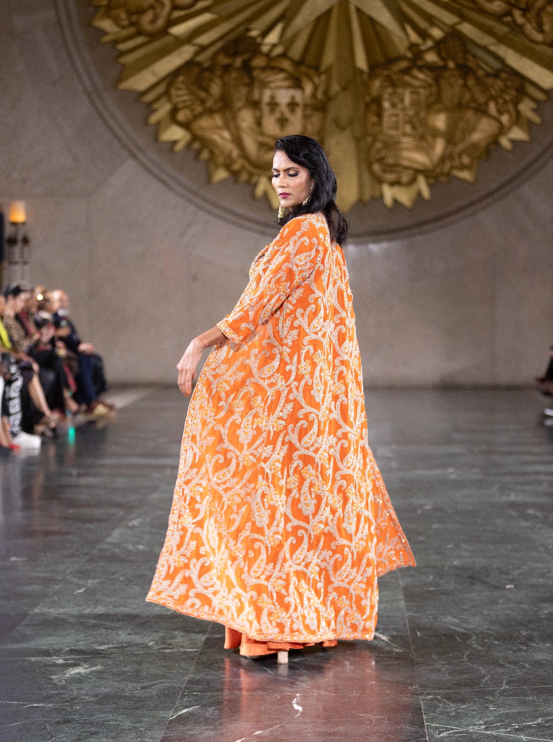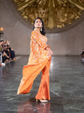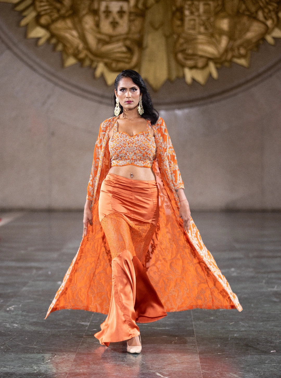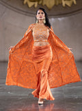 Radiate warmth and confidence in the Sunset Aura Cape Set, an Indo-Western ensemble featuring a flowing orange skirt, a chic crop top, and a dramatic open cape. Perfect for runway moments, festive celebrations, or fusion fashion events, this look blends tradition with contemporary flair in every step.